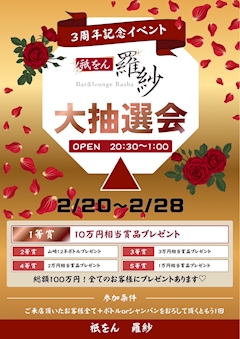 こんばんは☪️せらです💎 先週も羅紗🍷へ お越し頂きまして ありがとうございます🫡 先週2/20(金)から 今週末2/28(土)迄 羅紗🍷❸周年期間でーす 日頃の感謝🍀を込めて 全員当選する 大抽選会✨ 今年から開催🙌 みーんなで 楽しく過ごすぞーん♥️🐝 今宵は みんなお着物👘で♡ 出勤させて いただきます🧚🏻♀️