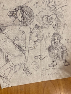 こんばんはろうです 乾燥してるからかダメージが来てます☝️ 喉が少し弱ってるので色々気をつけたい気持ち🥺 これはこないだお泊まり会した時に友達たちと深夜のお絵描き大会の時の 紙がなかったので紙ナプキンにゴリゴリ描いてました😂 本日は21時30分からよろしくお願いします🙇♀️