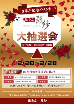 こんばんは☪️せらです💎 いつも羅紗🍷へ お越し頂きまして ありがとうございます🫡 明日2/20(金)から 2/28(土)迄 羅紗🍷❸周年期間でーす 日頃の感謝🍀を込めて 全員当選する 大抽選会✨ 今年から開催🙌 みーんなで 楽しく過ごすぞーん♥️🐝 今宵も せら出勤させて いただきます🧚🏻♀️